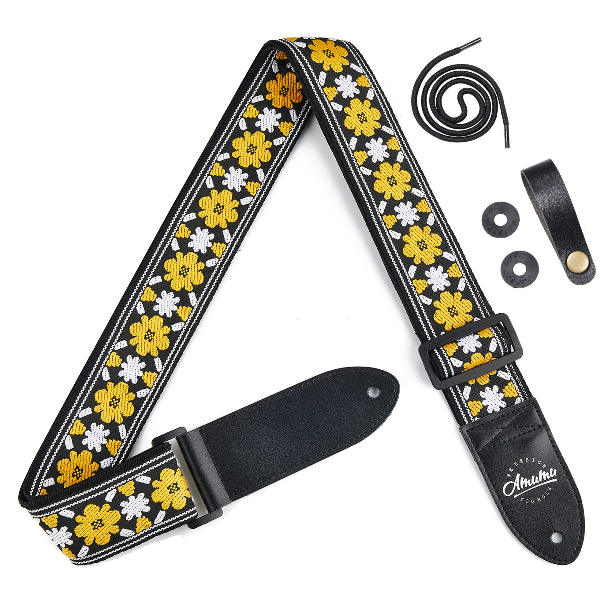 Amumu yellow-white jacquard guitar strap with premium leather ends and a widely adjustable length 37.5″ to 64″ (button hole to hole) to suit most players. Double layers of materials make the strap more durable and comfortable. The top layer is made from polyester with a flower pattern jacquard. The back layer is made from nylon. If you only have one bottom strap button on your guitar, the included headstock tie can help you get what you need!