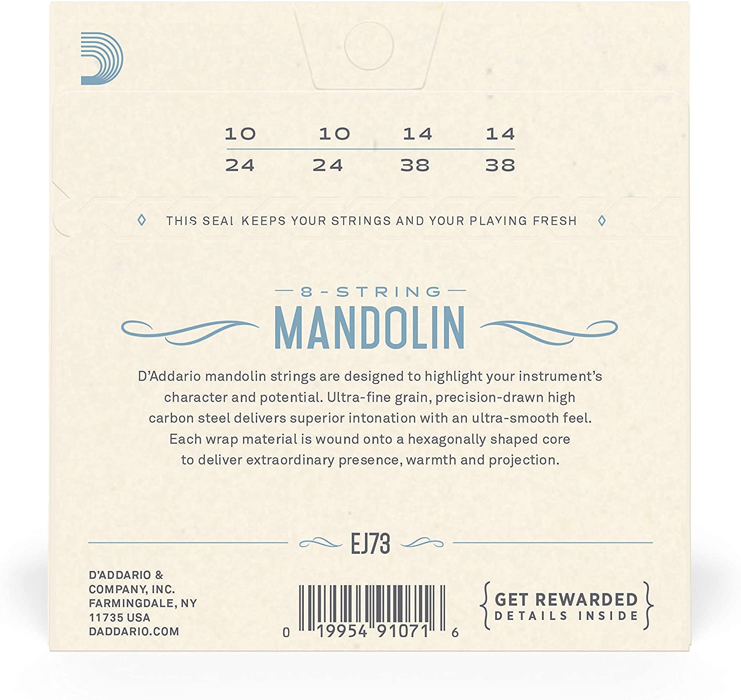 EJ73, D’Addario’ s most popular light gauge mandolin set, delivers warm and bright phosphor bronze tone with just the right amount of tension for easy playability and projection. Loop end construction for universal fit.