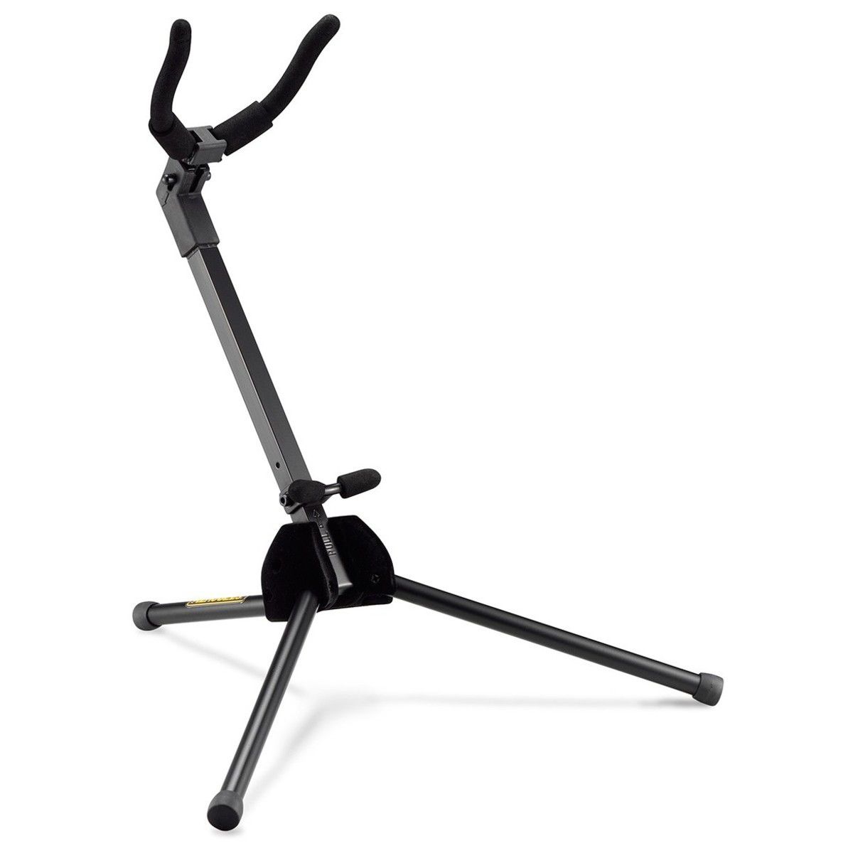 The HERCULES TravLite Alto Saxophone Stand DS431B folds easily and compactly and stores inside the bell of the instrument; velvet pads protect the instrument.