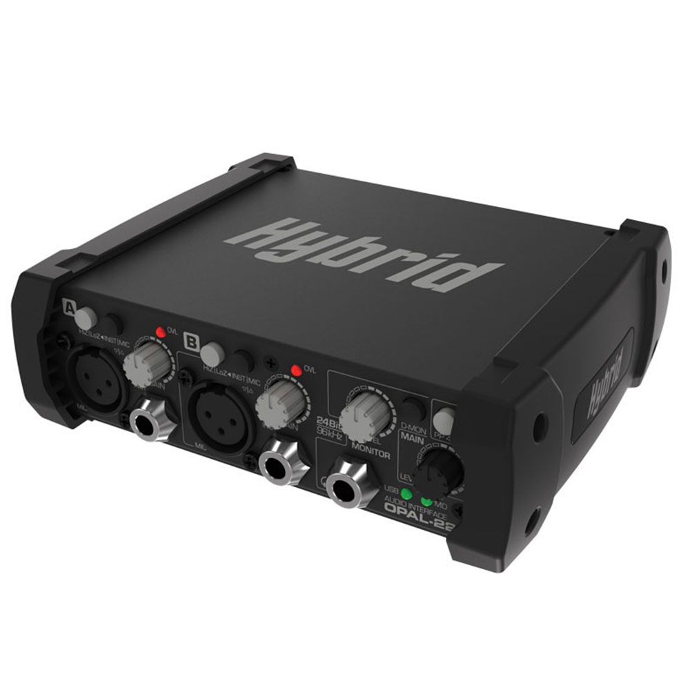 The Hybrid Opal 22 audio interface features a 2-channel IN/OUT Audio Interface with 48V Phantom Power for full Mic Dynamic Range. Direct monitor function routes inputs directly to outputs MIDI IN/Out Interface. Analogue to Digital Conversion via AKM5358. It provides 24Bit/96KHz Resolution for recording XMOS USB Audio Interface Chipset with Low-Latency Asio driver.