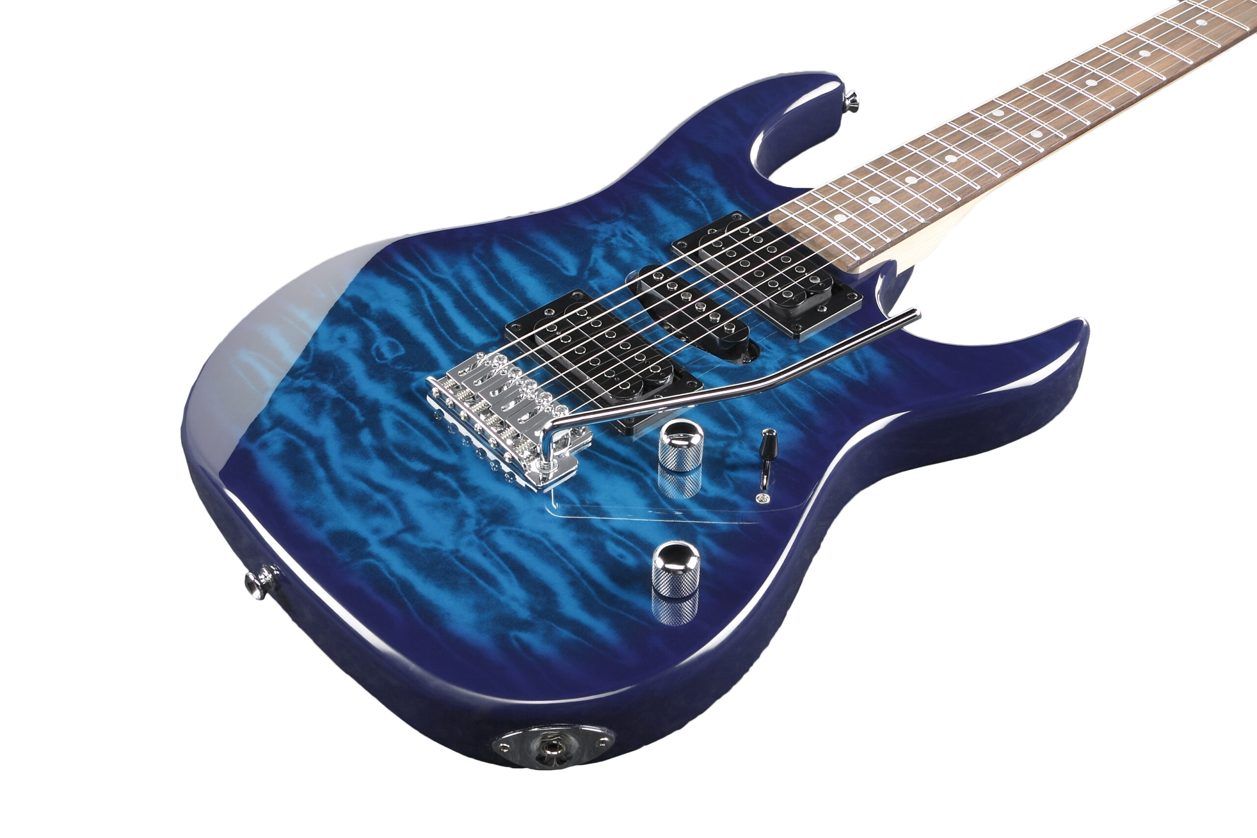 Featuring a poplar body with quilted maple art grain top, the GRX70QA produces balanced tone with visual flair, while the GRX maple neck with purpleheart fingerboard ensures smooth, confident playability. Equipped with a versatile pickup configuration and a tremolo bridge, this guitar gives players expressive tonal options and stage-ready performance. The stunning Transparent Blue Burst (TTB) finish enhances the instrument’s look with depth and character.