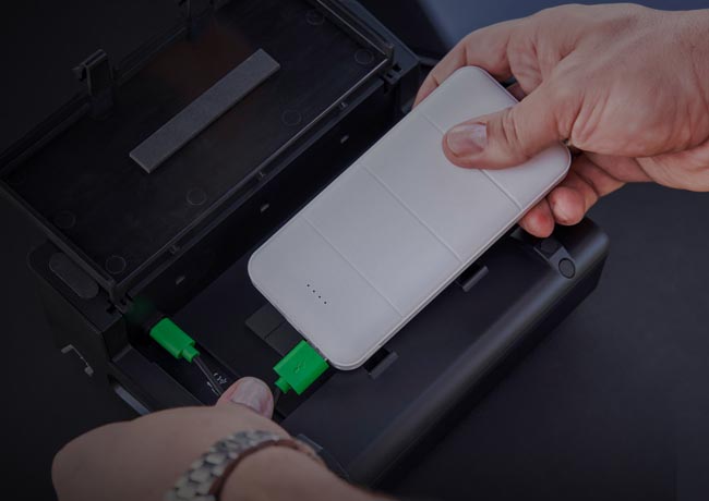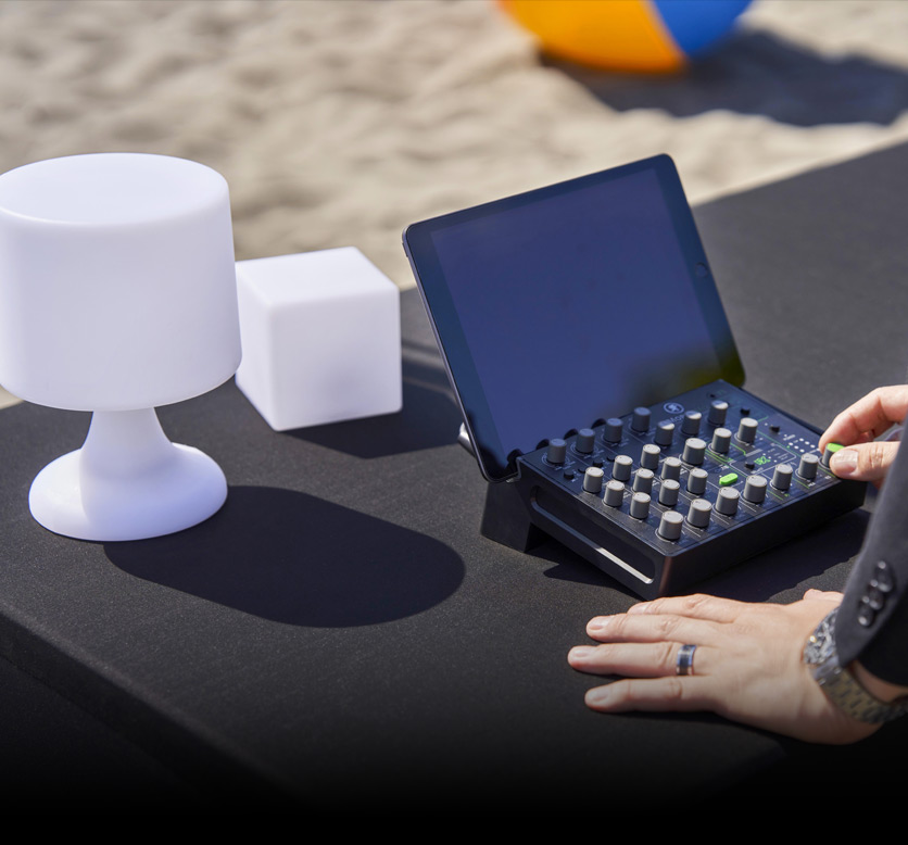 MobileMix runs on flexible USB power, giving you countless options for running sound away from outlets. Our favorite is to use a rechargeable USB battery,* the same kind you’d use for your smartphone or camera. MobileMix has a hidden battery compartment underneath, designed to fit most external batteries, turning MobileMix into a truly battery-powered mixing console.