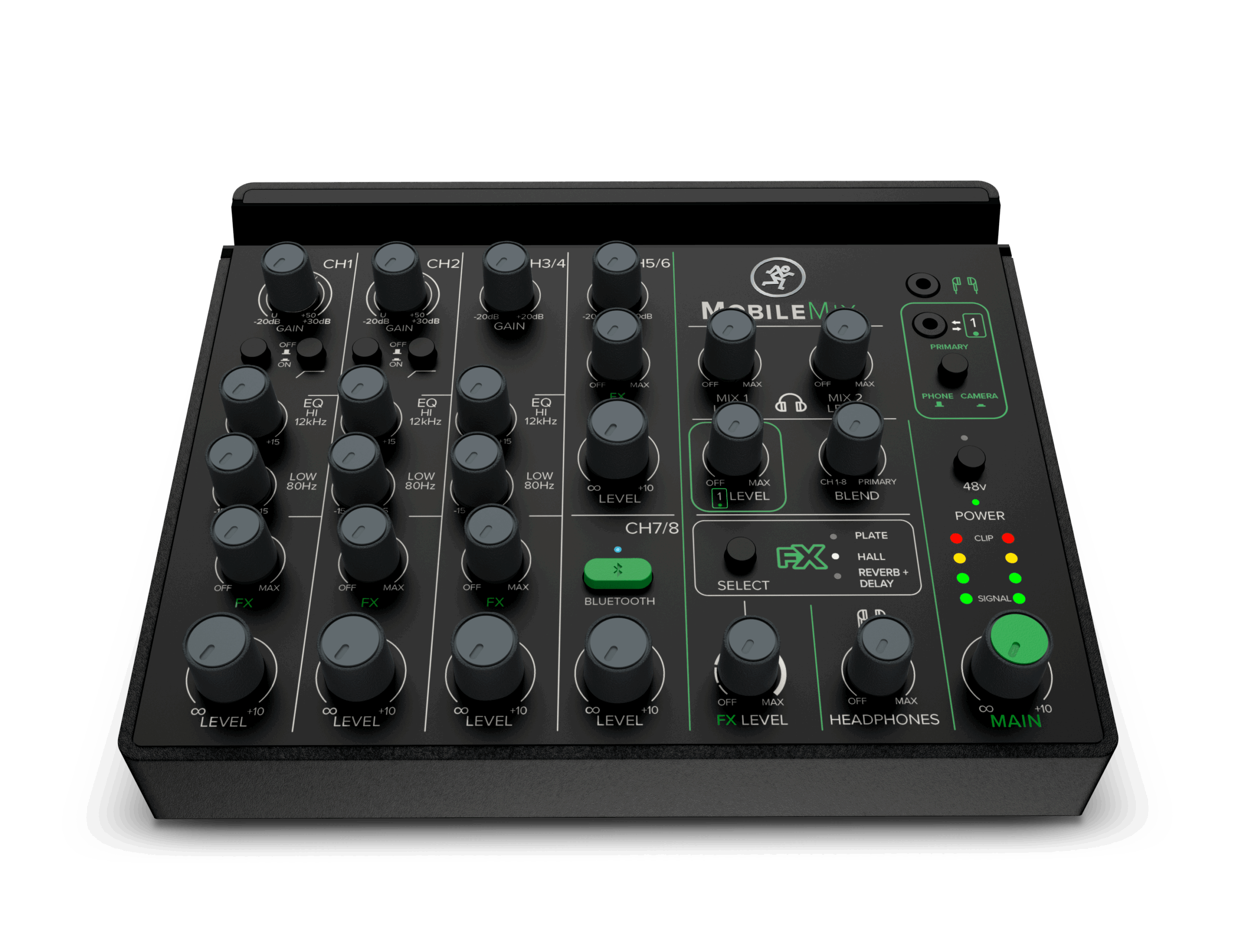 MobileMix packs the legendary build quality and excellent sound that make Mackie trusted worldwide. It begins with two fully featured microphone preamp channels with combo XLR and 1/4“ connectors, Hi-Z impedance switches for electric guitars and other passive instruments, low-cut filters and 48V phantom power for condenser mics.
