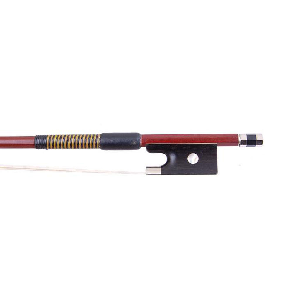 Hand varnished Brazilwood with imitation whalebone lapping and leather thumb band. The bow has a half mounted ebony frog and three part button.