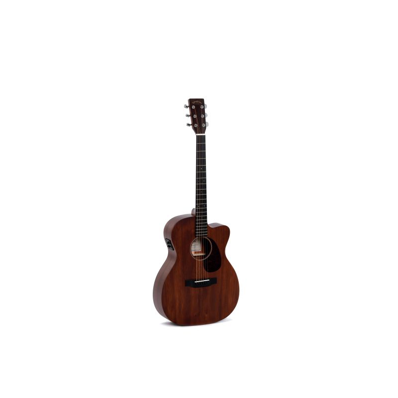 The Sigma 000MC-15E solid top acoustic guitar features a Mahogany top with Mahogany back and sides, bone nut, and saddle. A Fishman Presys II pickup system with a tuner.